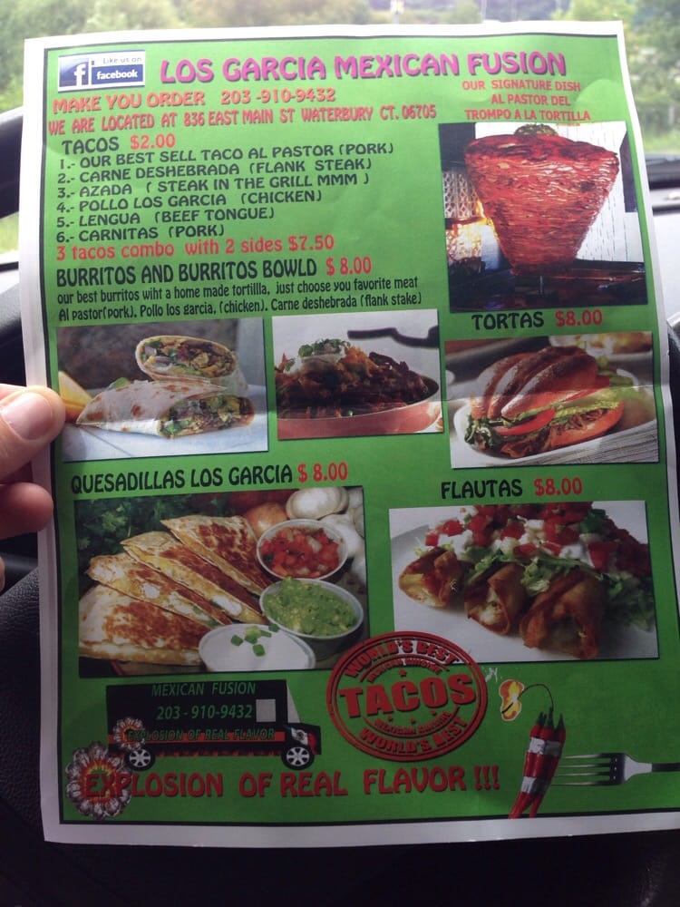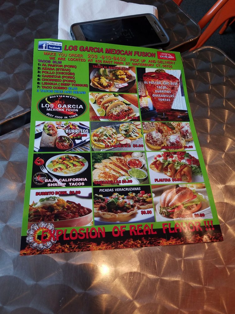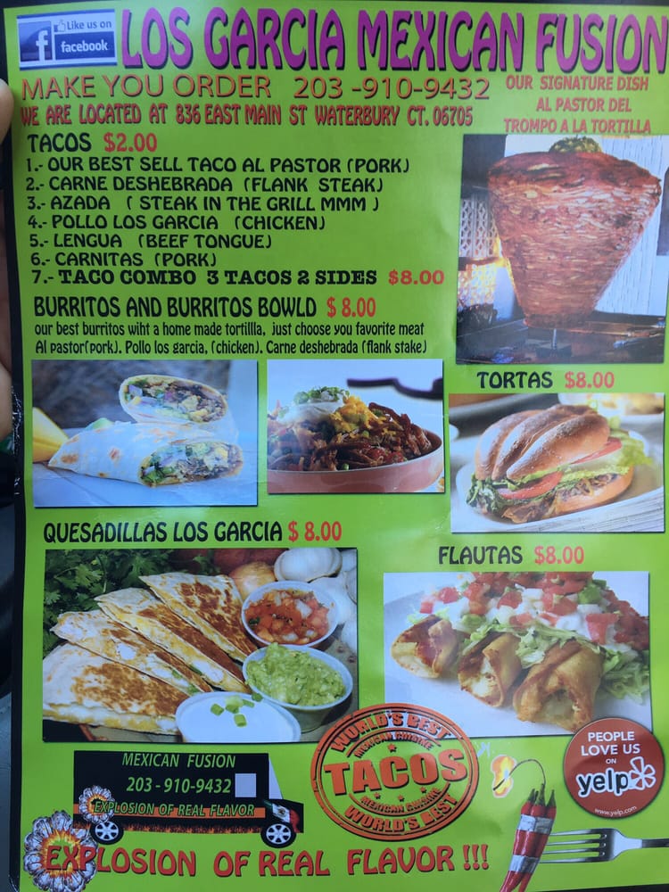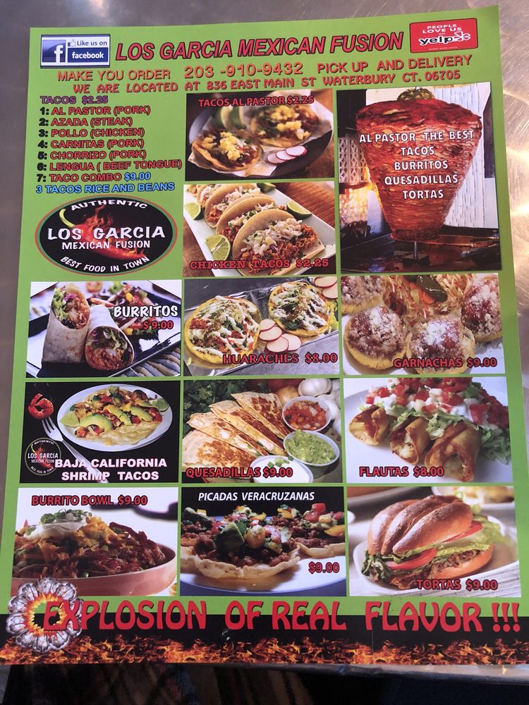 Introducing the menu at Los Garcia Mexican Fusion, located in Waterbury, CT, where Mexican flavors come alive. The menu offers a variety of classic dishes like Arros a La Mexicana, Flautas, Quesadillas, Tacos, and Burritos with options for meat lovers and vegans alike. The ambiance brings a festive Mexican vibe with friendly service and a lively atmosphere. Customers rave about the birria tacos, churros, shrimp tacos, and flautas with cilantro or habanero sauce. Vegetarians will find limited options but can enjoy the flavorful dishes with modifications. The salsa bar adds an extra kick to the fresh and delicious meals. Despite being cash-only, Los Garcia Mexican Fusion is a must-visit for taco lovers looking for authentic Mexican fusion cuisine.